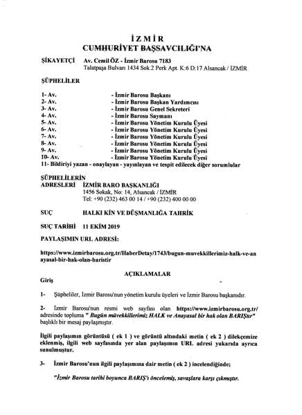 İzmir Barosu Başkanı’nı ve yönetim kurulunu onurlu davranmaya,